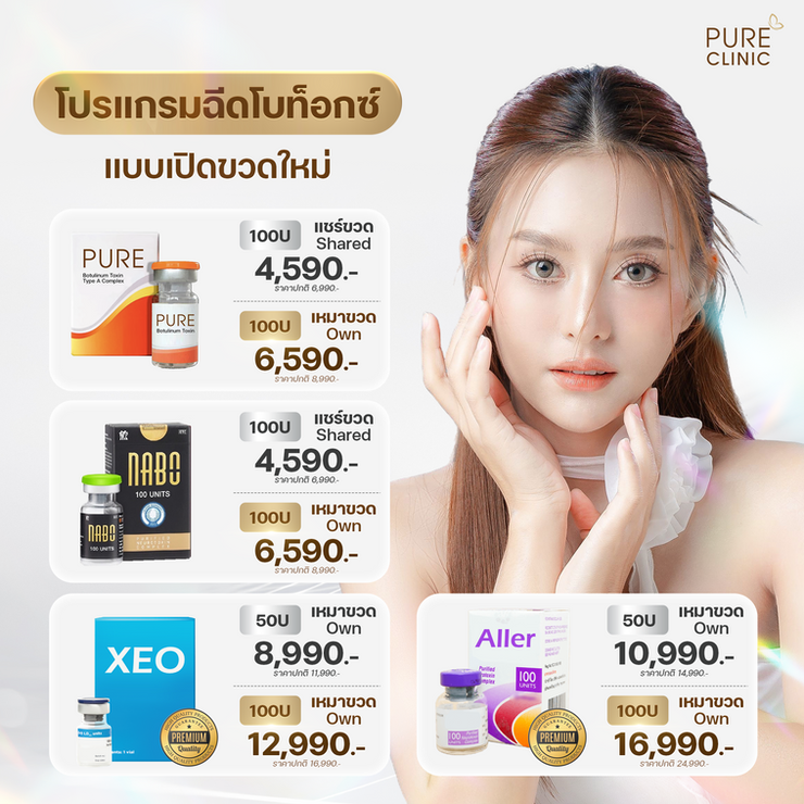 Botox (โบท็อกซ์) คือบริการเสริมความงามที่ช่วยลดเลือนริ้วรอย พร้อมปรับรูปหน้าให้ดูเรียวกระชับอย่างเป็นธรรมชาติ ที่ Pure Clinic เราเลือกใช้ผลิตภัณฑ์คุณภาพสูงที่ผ่านการรับรอง ปลอดภ ัย และดูแลโดยแพทย์ผู้เชี่ยวชาญในทุกขั้นตอน ให้คุณมั่นใจในผลลัพธ์ที่ดูดีและเหมาะกับตัวคุณ